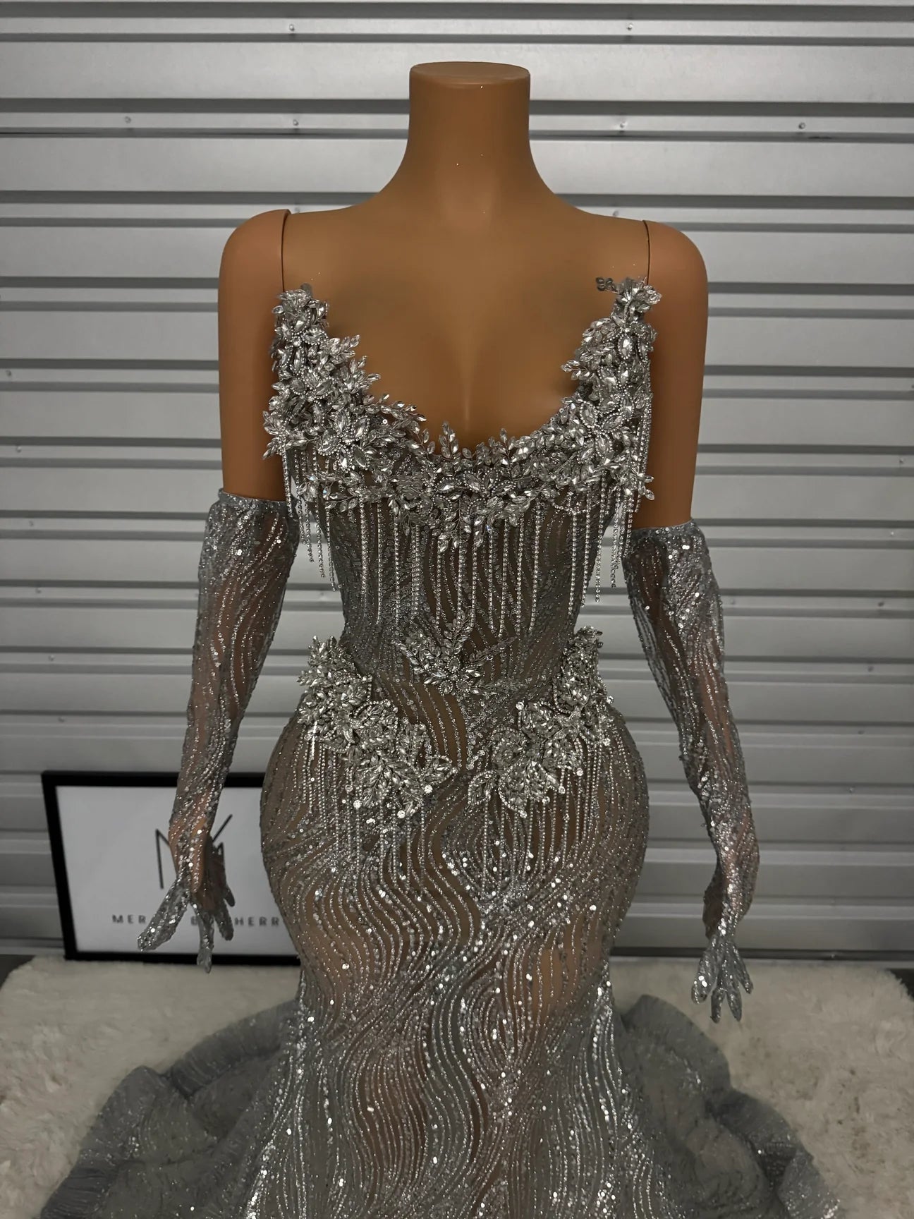• Silver prom dress made with sparkly fabric and silver rhinestones